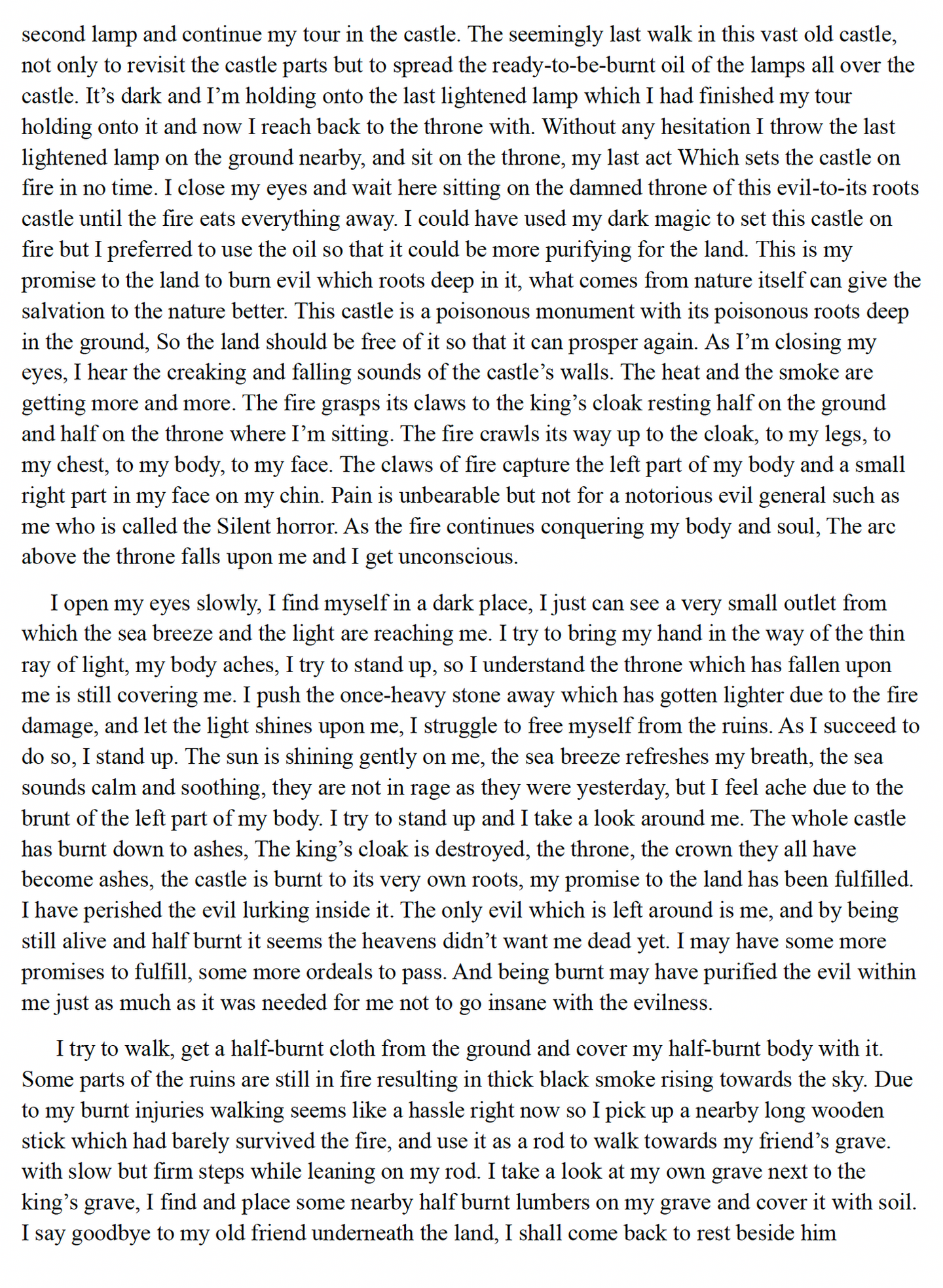 This piece displays remarkable creative brilliance. The world-building, character exploration, and the villain’s moral transformation are not only original but executed with a maturity rarely seen at this level. Symbolic elements—light, corruption, madness, and rebirth—are woven seamlessly into the narrative, enriching the thematic impact. The story demonstrates a deep understanding of narrative craft, imaginative scope, and emotional resonance. It is truly exceptional work.